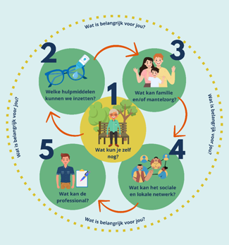 De schijf van vijfDe Schijf van vijf is een hulpmiddel dat zorgmedewerkers helpt om in gesprek te gaan met cliënten en hun naasten over eigen regie. Aan de hand van vijf stappen wordt het “Ik doe mee gesprek” gevoerd. Door te werken volgens de Schijf van vijf kan Joris Zorg meer mensen helpen met hetzelfde aantal zorgmedewerkers en de eigen regie van cliënten vergoten. |