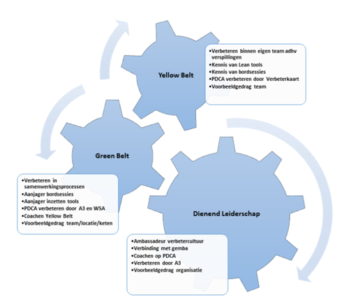 De gewenste coaching binnen alle organisatielagen wordt geboden door de interne Black Belt/Lean coach en waar nodig, met extra ondersteuning door Verbeta (voorheen Lean@Verbeten). De coaching en doorontwikkeling op team- en locatieniveau wordt geborgd door de interne Lean coach binnen de afgesproken kaders. Het principe “Coach de coach” heeft geleid tot het vergroten van het uitdragen van de Lean filosofie. |